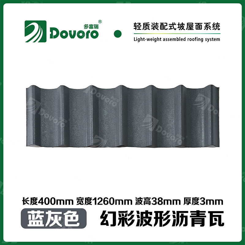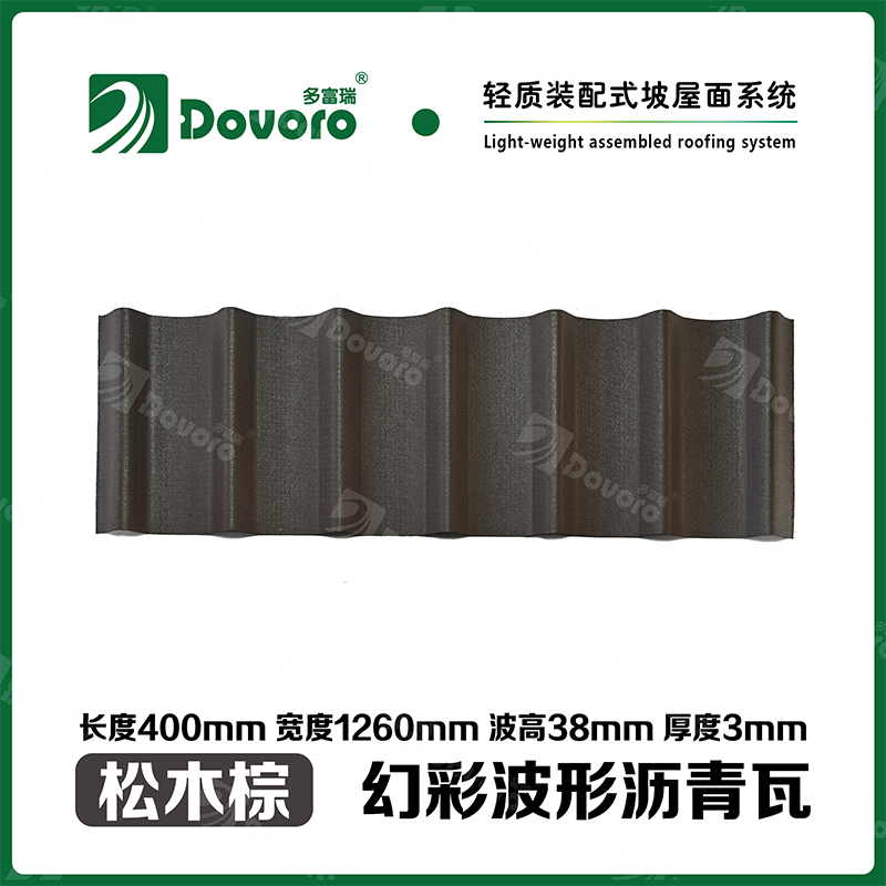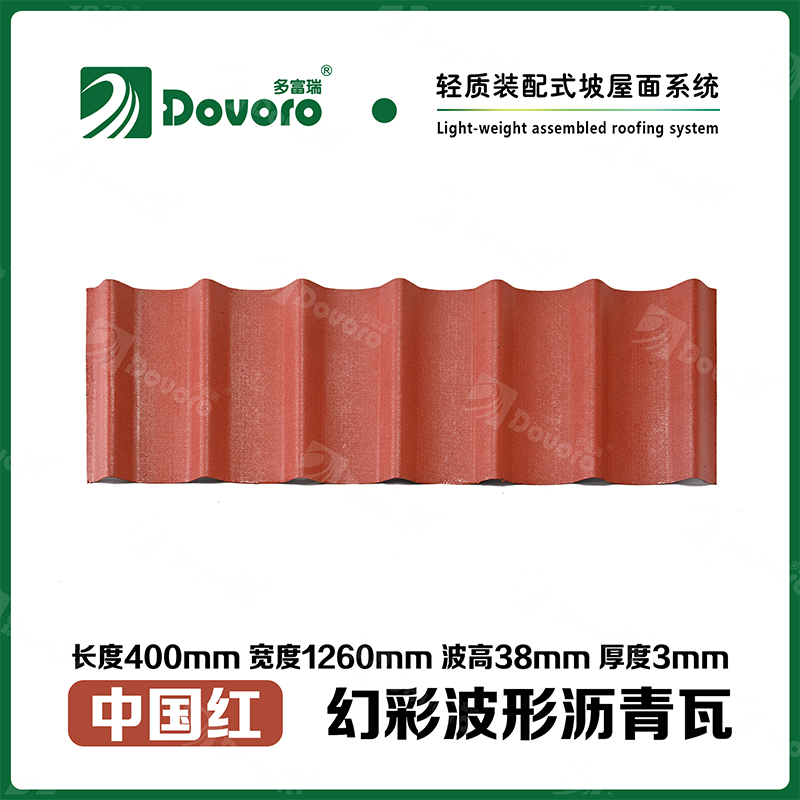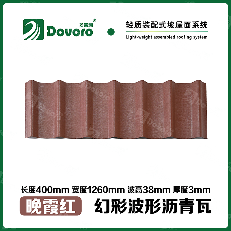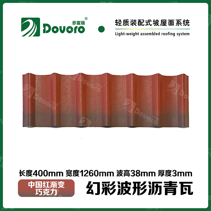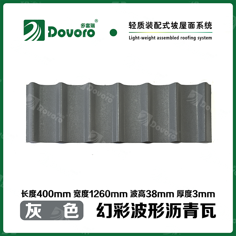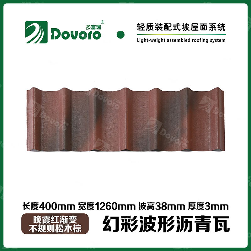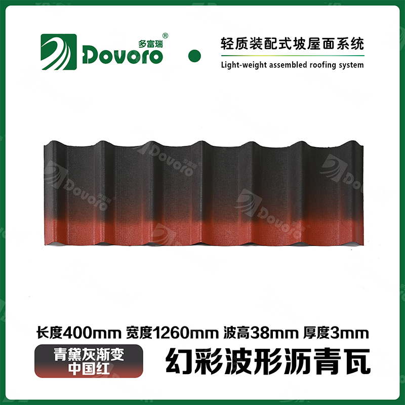 多富瑞幻彩波形瀝青瓦是由礦植物纖維板經過整形后浸漬瀝青而成,一次成型的基層板在高溫下浸漬瀝青,使瓦材整體性更加牢固;熱固性樹脂保證了瓦材的強度和剛度;進口原料配合先進的著色工藝確保顏色持久、混色噴涂工藝使瓦材外觀高雅、色彩美觀、立體質感。