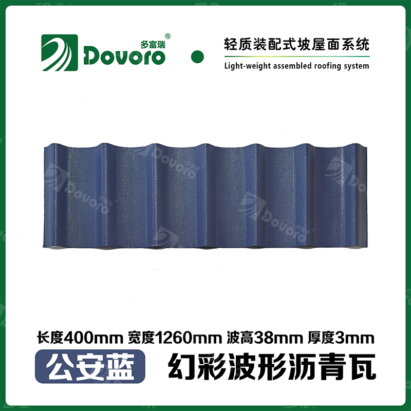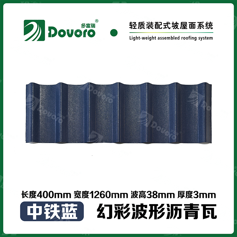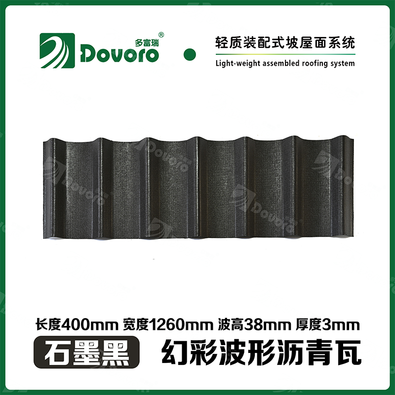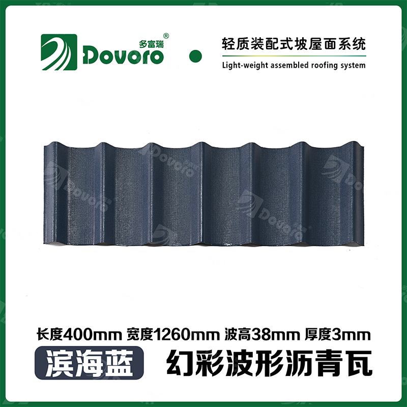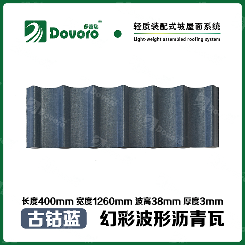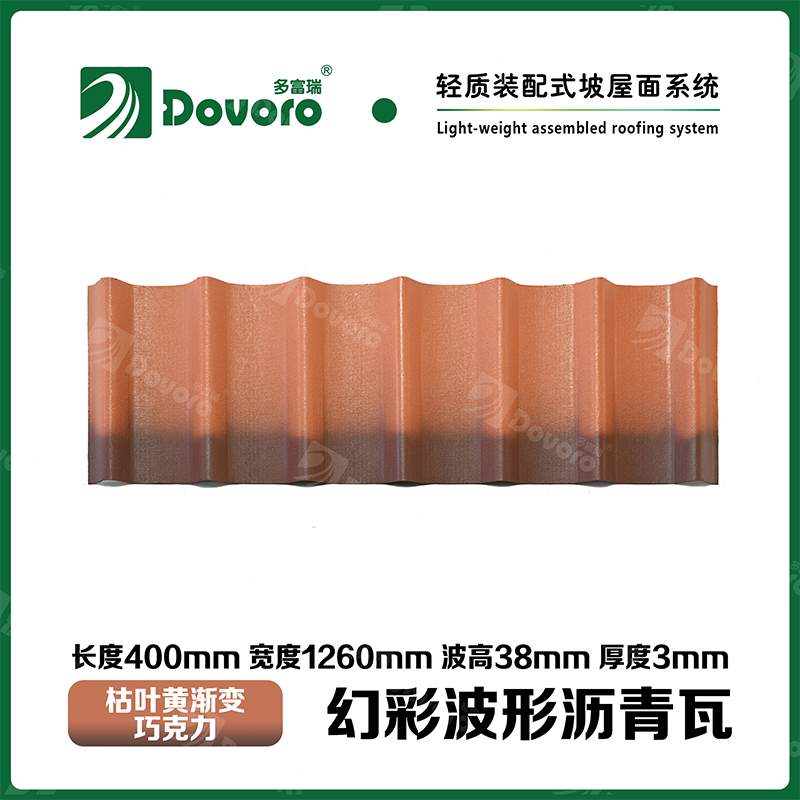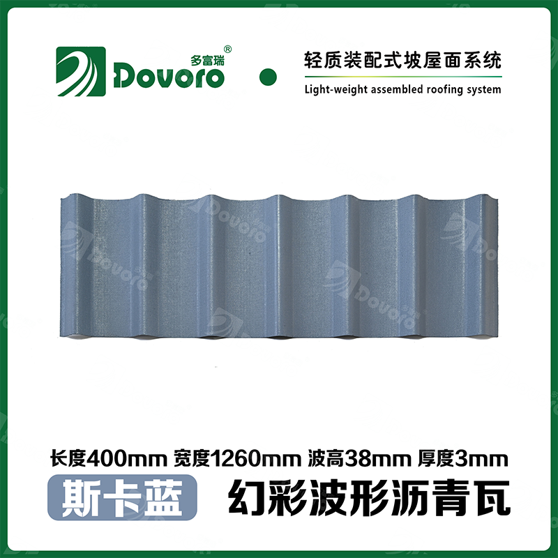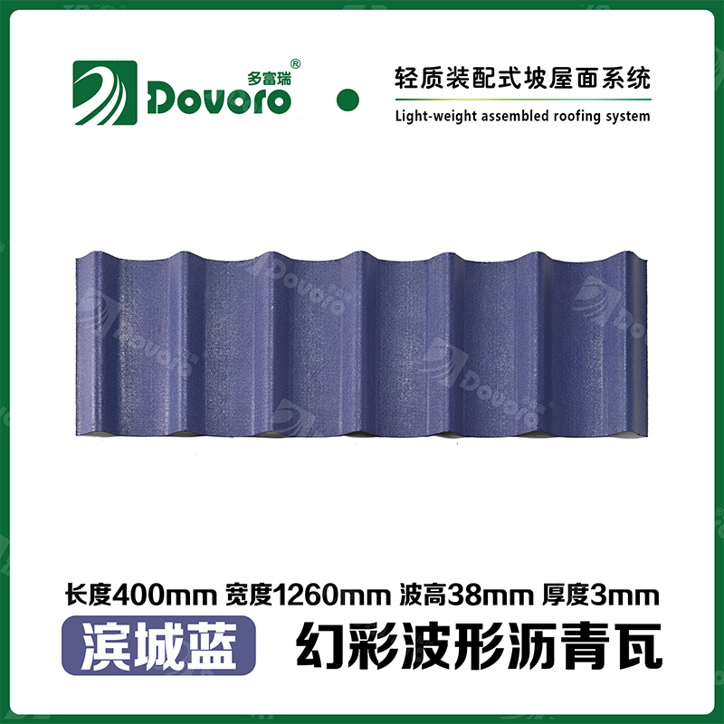 多富瑞幻彩波形瀝青瓦是由礦植物纖維板經過整形后浸漬瀝青而成,一次成型的基層板在高溫下浸漬瀝青,使瓦材整體性更加牢固;熱固性樹脂保證了瓦材的強度和剛度;進口原料配合先進的著色工藝確保顏色持久、混色噴涂工藝使瓦材外觀高雅、色彩美觀、立體質感。