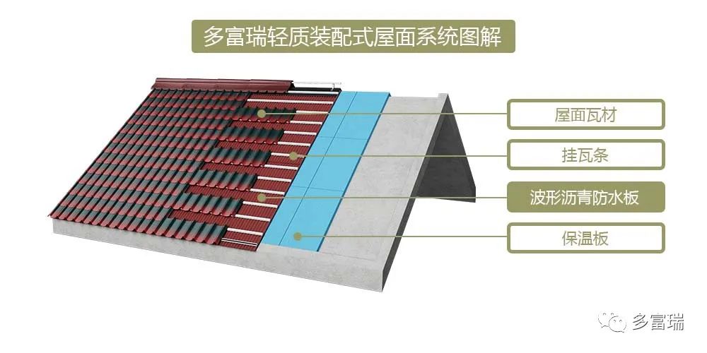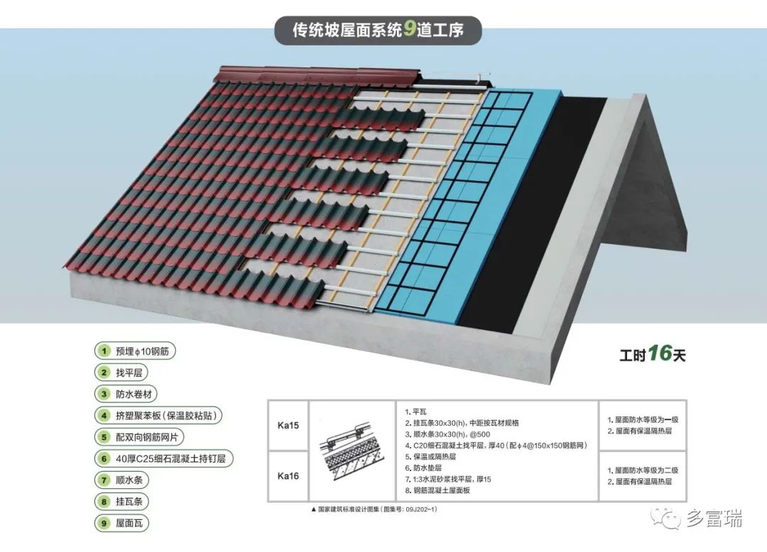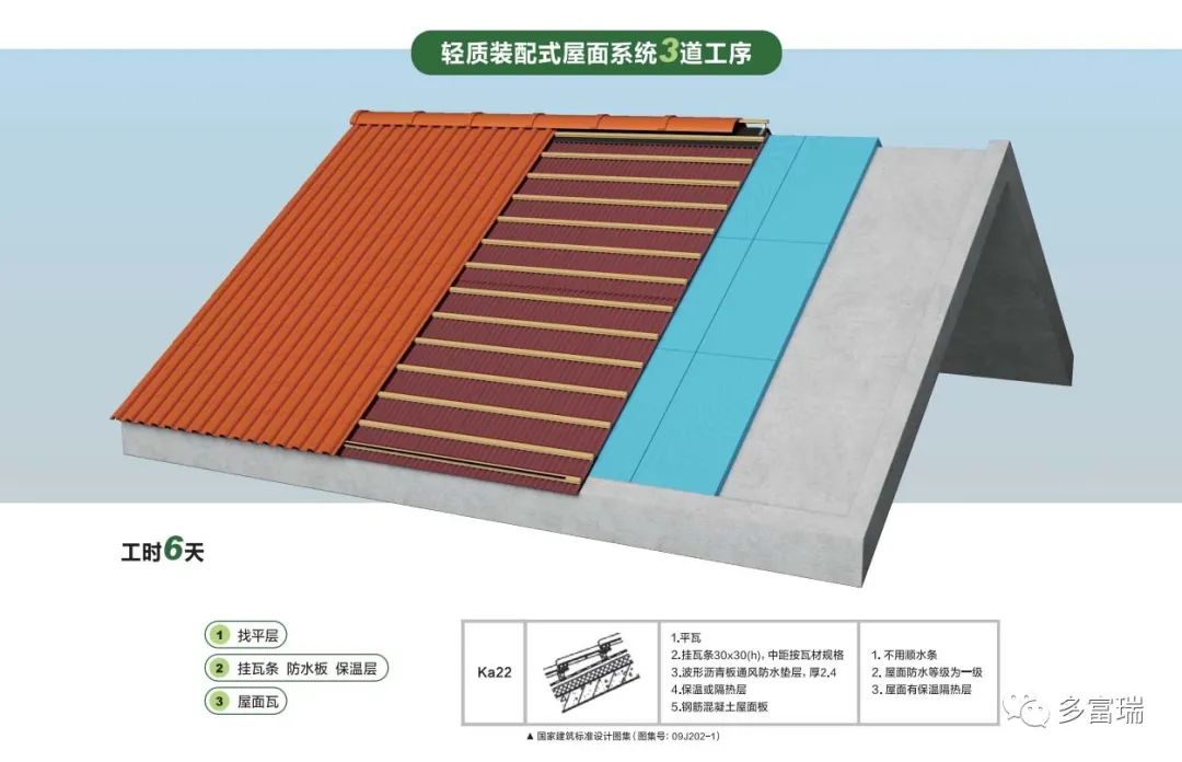 而多富瑞的輕質(zhì)裝配式坡屋面系統(tǒng),全部采用物理連接的方式,施工對天氣沒有要求,僅需3道工序,工期可節(jié)省一半以上,總造價可節(jié)省15%-30%。