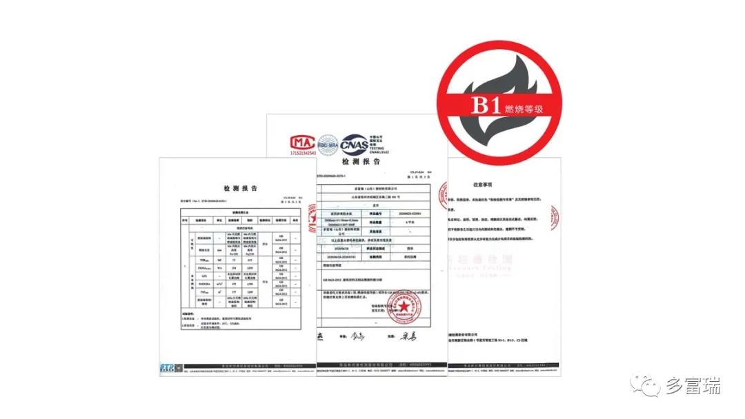 多富瑞產(chǎn)品符合最新的《建筑材料及制品燃燒性能分級》(GB8624-2012),B1級防火材料標準。