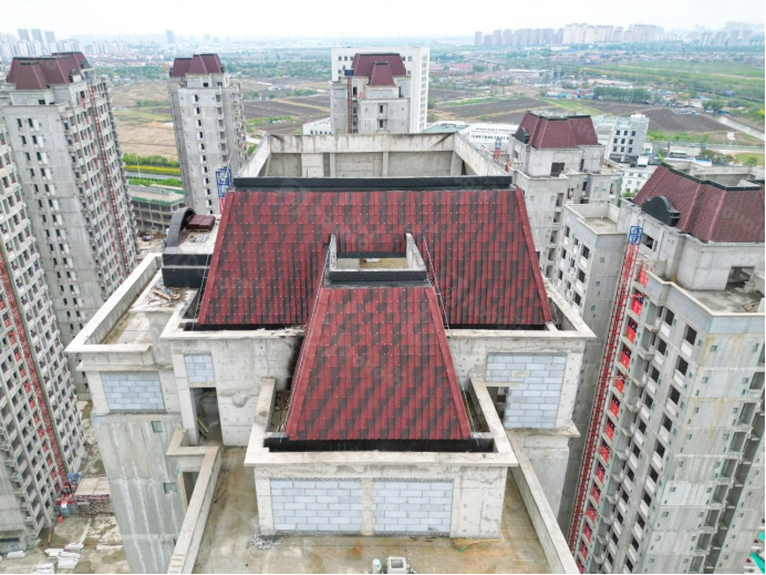 本項(xiàng)目位于天津市津南區(qū)北閘口示范鎮(zhèn),建筑面積30.82萬平方米,實(shí)現(xiàn)1429戶居民的“安居夢”。在本項(xiàng)目中,多富瑞波形瀝青瓦作為裝飾性材料,為建筑屋面增添獨(dú)特魅力。