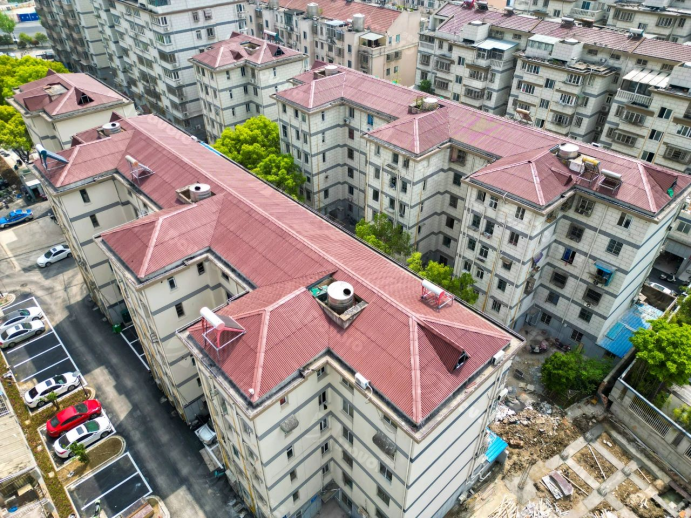 “月秀東園平改坡項目”位于無錫市濱湖區,小區建成于1981年,其中部分樓棟的屋面為平屋面,部分屋面為坡屋面。對原先平頂屋面的樓棟進行坡屋面改造,采用幻景波形瀝青瓦施工,達到整體造型的統一,提升住戶居住舒適性。