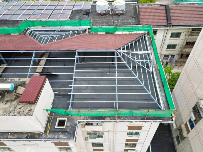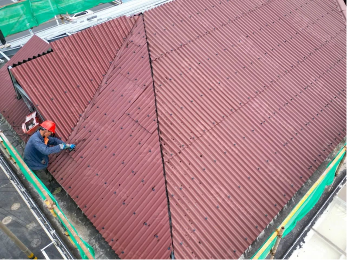 “無錫月秀東園項目”采用單層波形瀝青瓦的施工方案,將原先的平頂屋面清理后涂刷防水涂層,在平頂屋面上搭建坡屋面鋼構,使用瓦釘將波形瀝青瓦固定至鋼檁條。