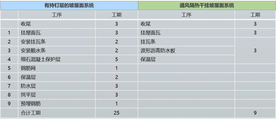 輕質坡屋面系統施工極為方便,在屋面基層上鋪設保溫層、波形瀝青防水板,使用掛瓦條加以固定,再鋪設屋面瓦即可。以200平坡屋面為例,傳統的有持釘層的坡屋面系統,需要25天的工期,而輕質坡屋面系統僅需9天,約為傳統坡屋面做法的三分之一。