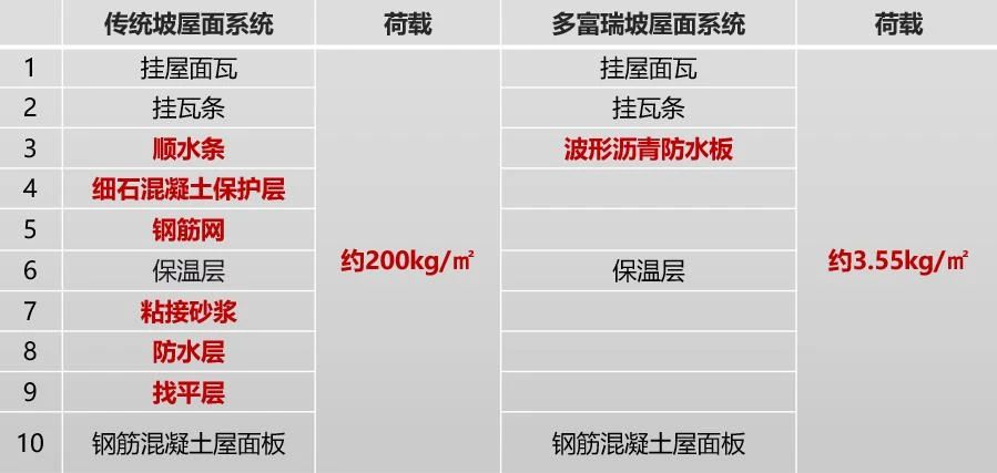 傳統坡屋面中的細石混凝土保護層、鋼筋網、砂漿、找平層都是重量大戶,每平米約200kg。波形瀝青防水板每平米僅重3.55kg,即可代替200kg的屋面構造。