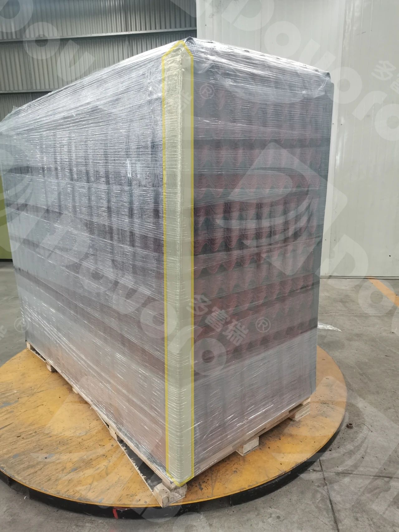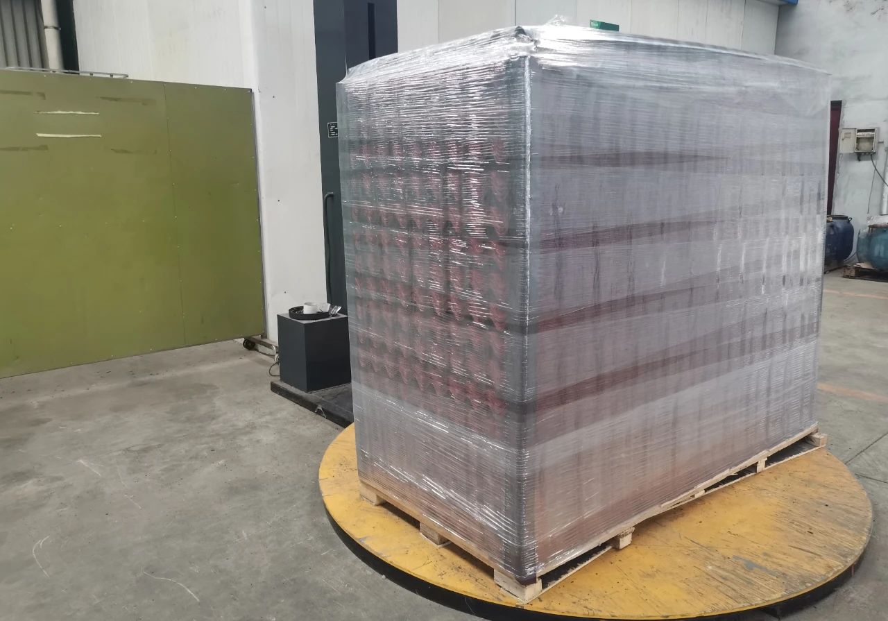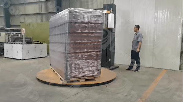 進行完以上流程后,貨物在包裝機上完成包裝的最后步驟。使用具有韌性的包裝膜,對貨物的整體進行纏繞,固定住四個角落的護邊和上方的蓋帽。不僅使貨物更整體更穩固,也將貨物密封在包裝之中,與周圍不確定環境隔離。
