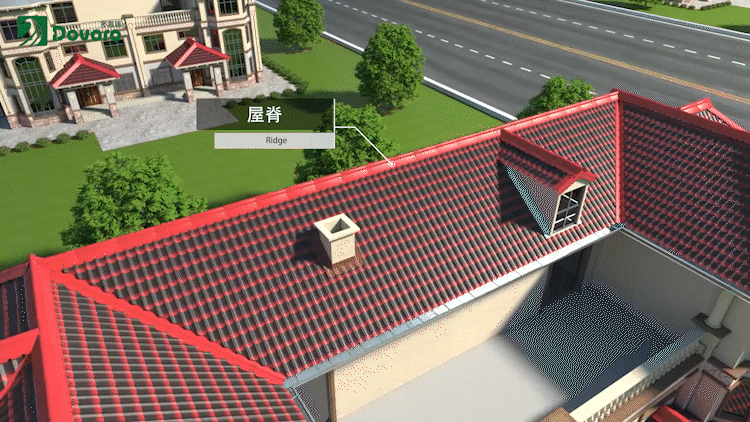 在屋脊前后坡的兩塊波形瀝青防水板接縫處,粘貼通風卷材。通風卷材有利于氣流流通,同時可以提供防水防塵的保護。最后在上方鋪設特制的脊瓦。