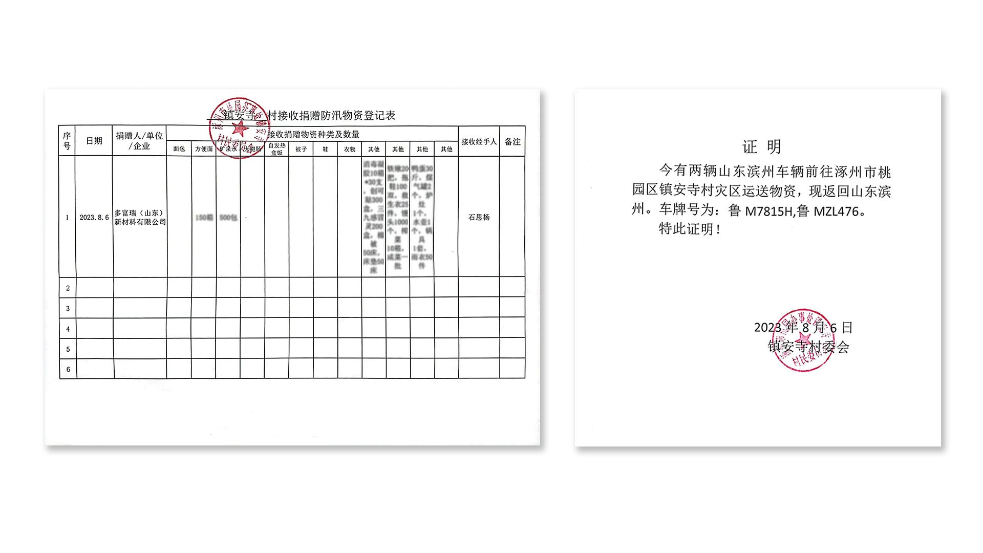 企業之興,源于社會之力。我們深知企業的發展與社會息息相關,承擔著創造社會價值的重要責任。在嚴峻的挑戰面前,多富瑞秉承“誠篤至信,臻于至善”的企業文化,將企業社會責任轉化為實際行動,以綿薄之力支持涿州搶險救災工作。